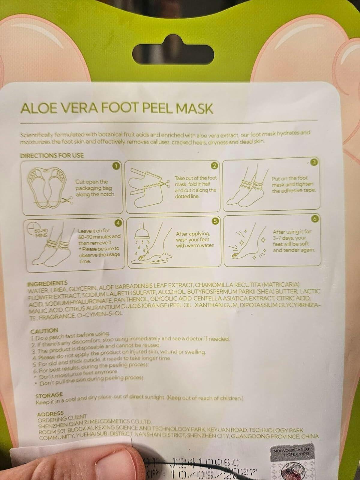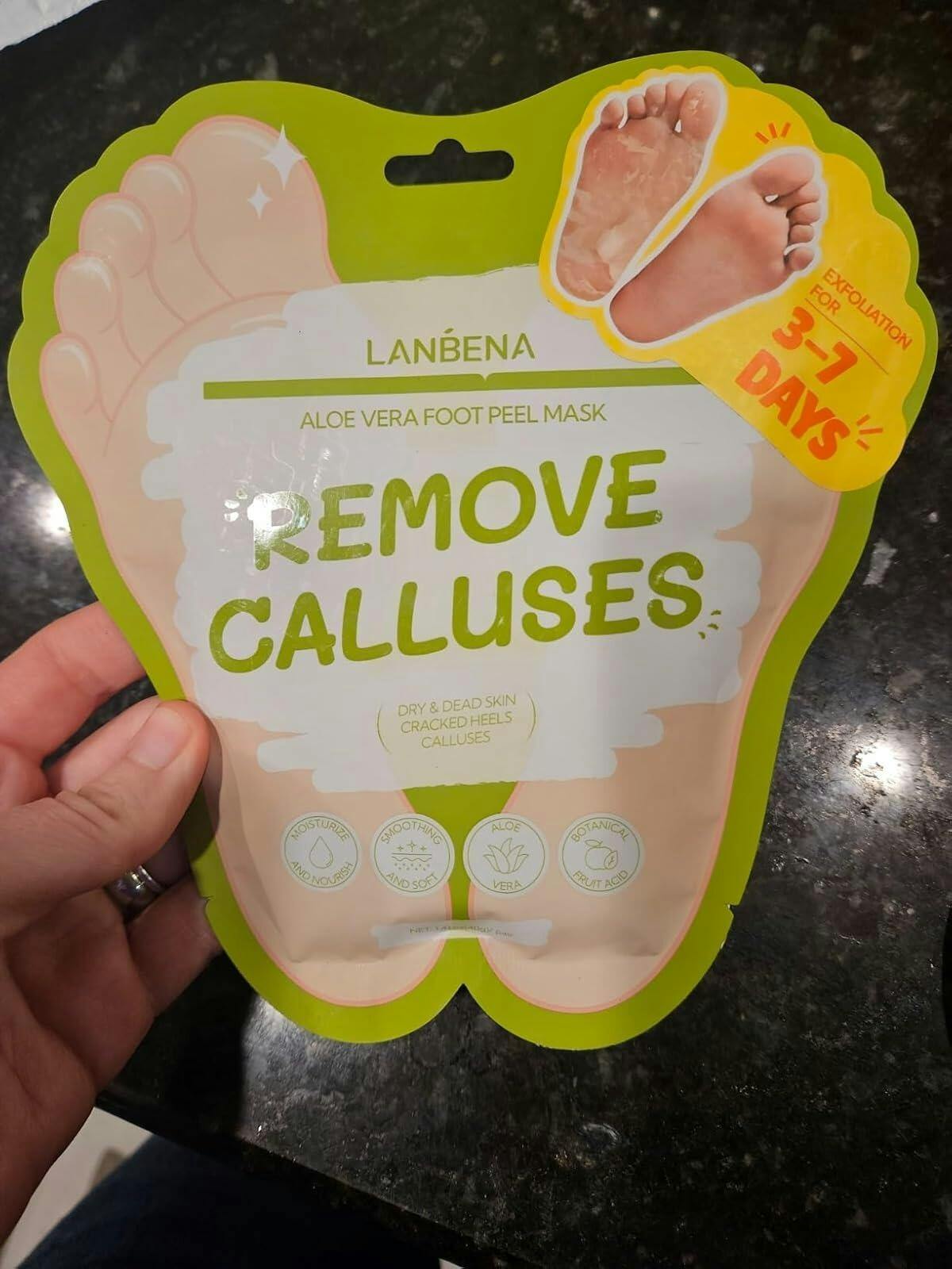 My husband used this one. he says the aloe scent smells good while you are using it. First things first: the instructions are not clear (removing 1 star). They say ‘after using it for 3-7 days your feet will be soft and tender again’, which I initially took to mean that I would need to use a new set of booties every day. This would not be cost-effective. There is a sticker on the front of the package, however, that said ‘exfoliation for 3-7 days’, and this is indeed what happens. The day after using your skin will feel tight; on day 2 it will feel tight and start to itch, peeling by day three. Even with dedicated scrubbing, hubby's feet continued to peel. This works as advertised, it's just gross….